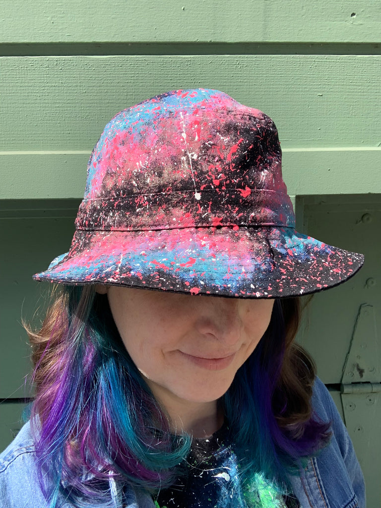 A solid black cotton bucket hat is painted with high quality textile paint so they are washable and water safe. Charge the glow paint by wearing it in the light (sunlight works best) and it will glow in the dark. The longer you charge it, the longer and brighter you will glow in the dark.