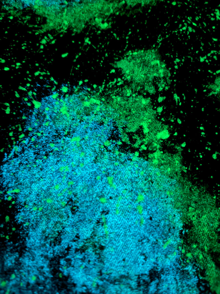This upcycled denim jacket was transformed with a hand painted glow in the dark cosmic design. We use only high quality paint that is heat set so the bright colors are permanent and washable. The glow paint charges best in the sunlight but will work with most light sources. The longer you expose it to light, the longer and brighter it will glow in the dark.
